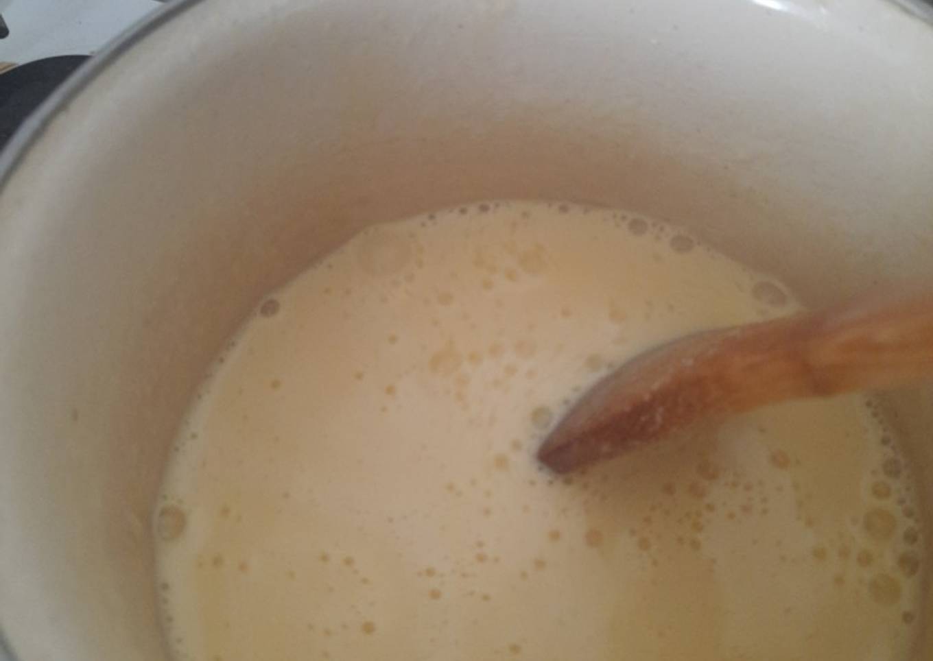 - Una vez listas las yemas y la leche, temperamos poniendo un poco de la mezcla de la leche en la mezcla de las yemas y vamos moviendo, después agregamos toda la mezcla de las yemas a la leche de golpe y continuamos a fuego bajo y moviendo constantemente hasta que espese lo suficiente.