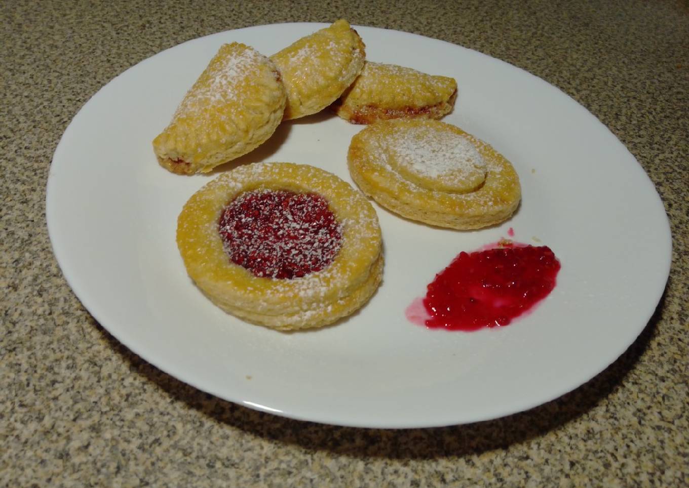 - Otra opción es cortar 2 círculos, hacer un corte circular más pequeño en el centro de uno de los círculos, los pegaremos con la ayuda de un huevo batido y rellenaremos con mermelada. (En caso de no tener cortadores podemos marcar los círculos y cortar con ayuda de un cuchillo)
