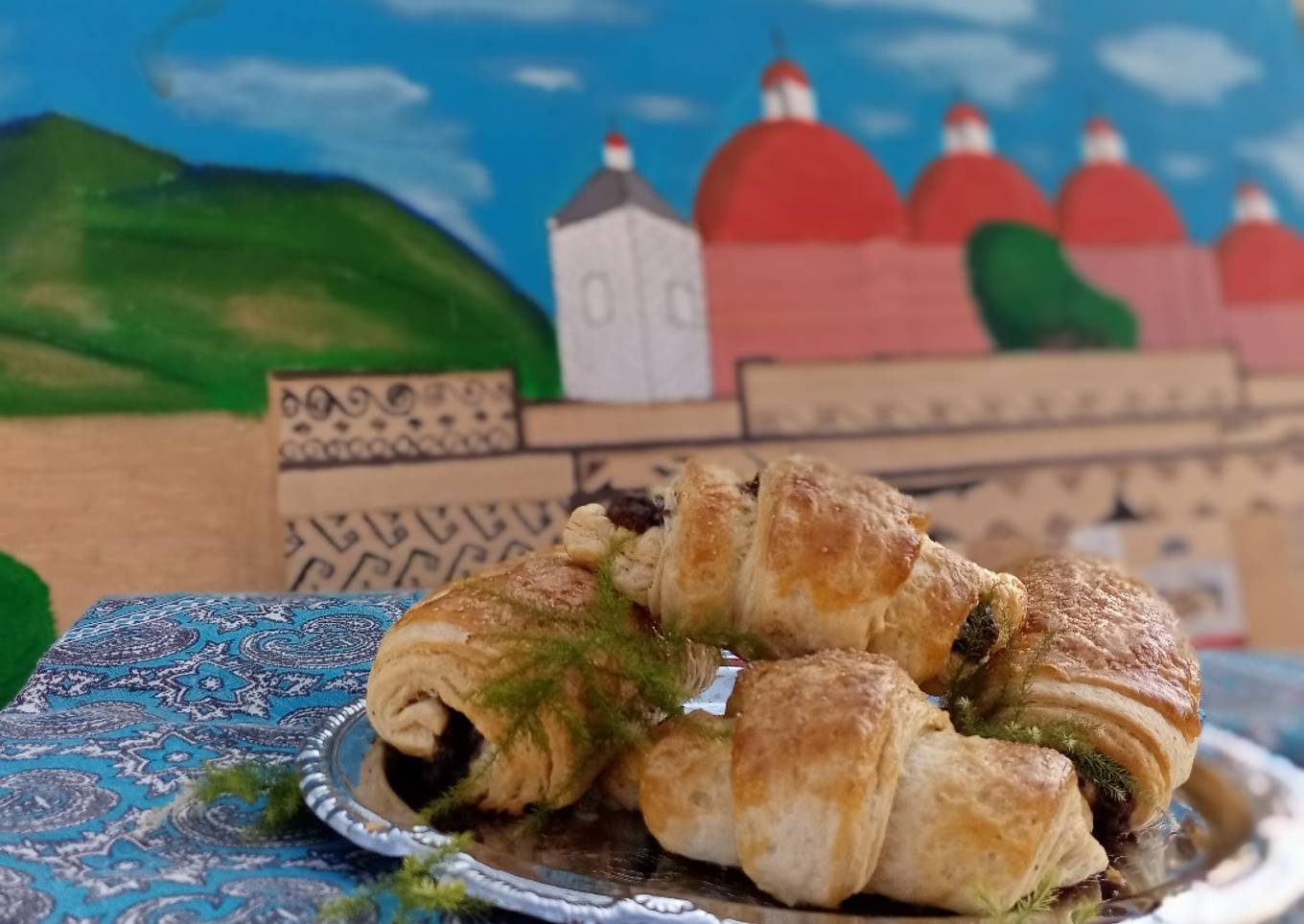 - La primera figura que haremos son cuernitos cortamos en triángulos, en la parte final hacemos un pequeño corte, colocamos nuestro chocolate amargo y enrollamos