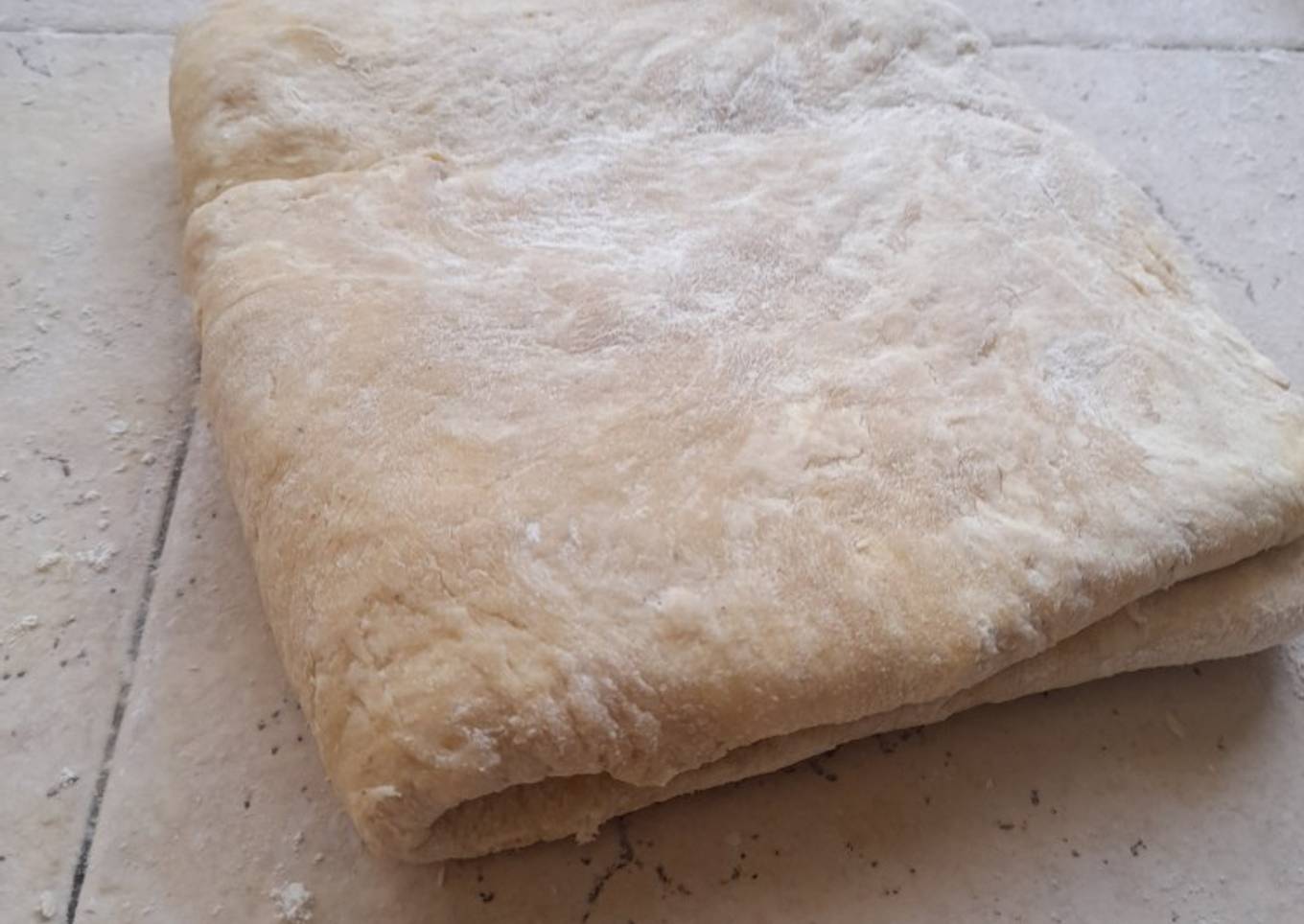 - Ya que se estiró se le agrega la margarina flex en cuadro y se cierra la masa. Después se comienza a estirar. Se le harán dos dobleces sencillos y uno doble.