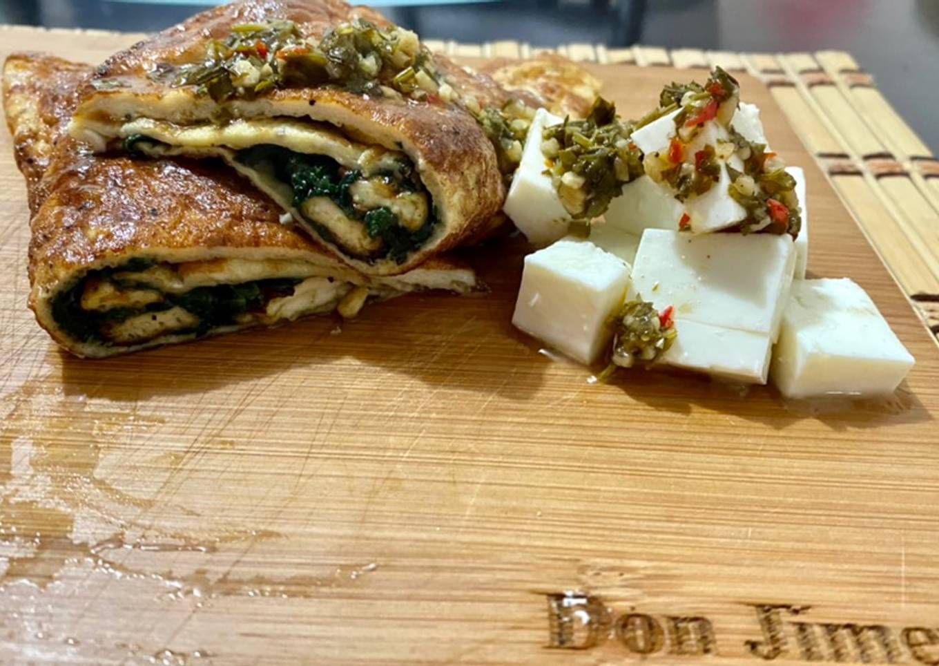 Omelette de panela frito con espinacas