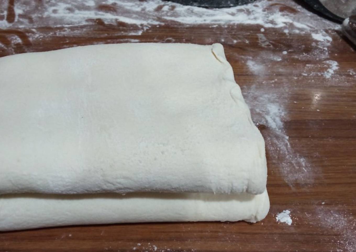 - Posteriormente tener la margarina a temperatura ambiente hacer un tipo rectángulo un cuadrado estirar la masa como un trébol dejando un poco gordo en medio para que la margarina quedé en ese pedazo y empezaremos a doblar de la manera de que cubra la margarina de arriba abajo de al lado al otro lado